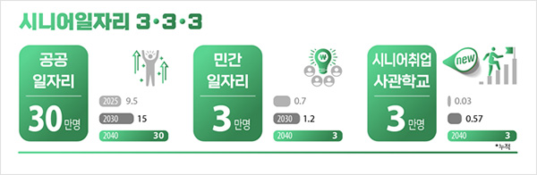 - ‘시니어 취업사관학교’ 운영 → 2040년까지 3만 명 취업 목표